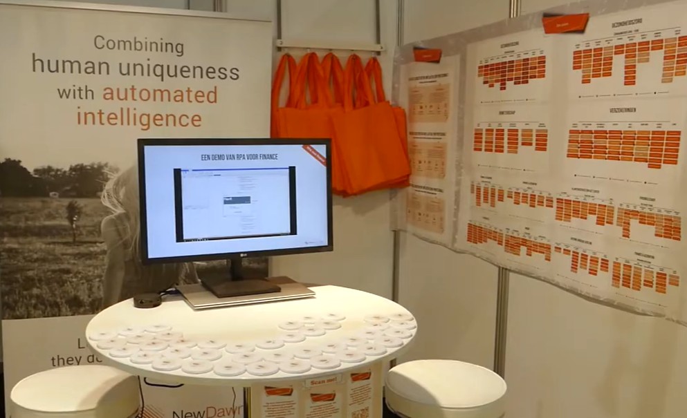 Voor NewDawn Robotics heb ik de deelname aan de beurs Zorg & ICT voorbereid en de Sponsorship UiPath. Voor deze evenementen heb ik marketingmaterialen gecreëerd en besteld. Daarnaast heb ik de relatiegeschenken geregeld en de uitnodigingen via social media gedeeld. Hieronder zie je de de stand bij de beurs Zorg & ICT.